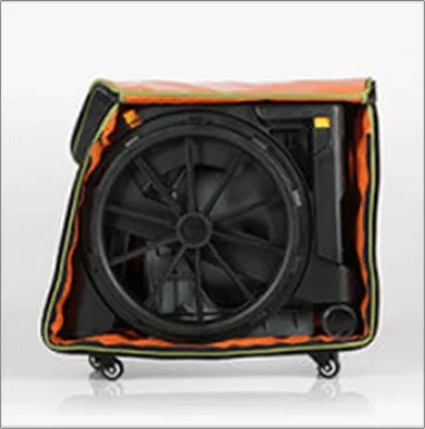 A collapsible and portable wheelchair and commode chair. Optional to buy wheeled travel case for ease of carrying and moving. Case marked with universal wheelchair symbol for transportation by aeroplane. Product weight only 12.6 Kg.