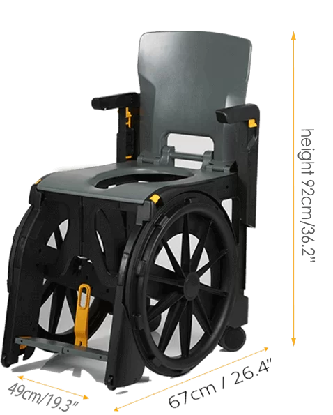 Thanks to its side wheels, can be moved by the seating person, and offers amazing maneuverability, especially in narrow spaces. Suitable for inaccessible toilets and Roll In Showers.